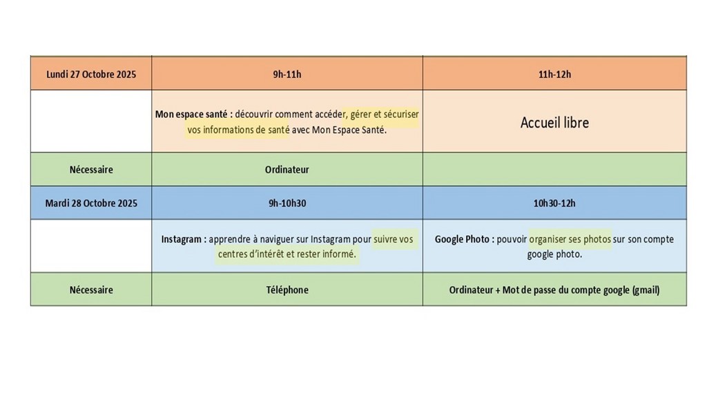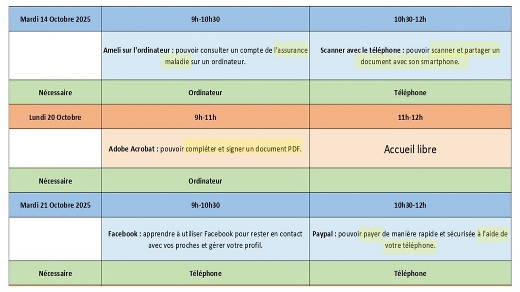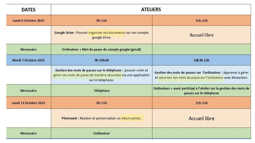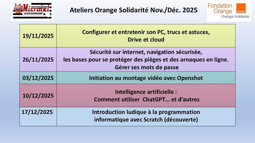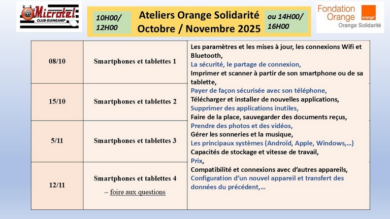Ces ateliers sont animés par les membres de l'association Orange Solidarité et ne comportent aucune obligation vis-à -vis de l'opérateur Orange (tous les ateliers sont gratuits et il n'y a absolument pas besoin d'être abonné Orange ni de le devenir).